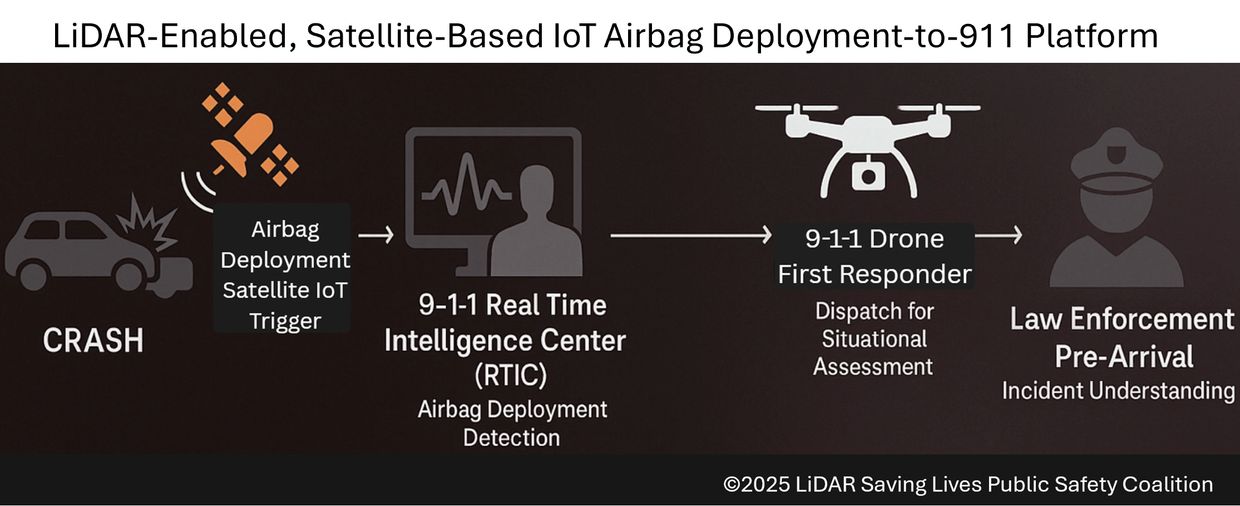 - LiDAR-Enabled, Satellite-Based IoT Airbag Deployment-to-911 Platform: Airbag deployment triggered CJIS-conformant crash data delivered directly to 9-1-1 RTICs in under 3 seconds.
